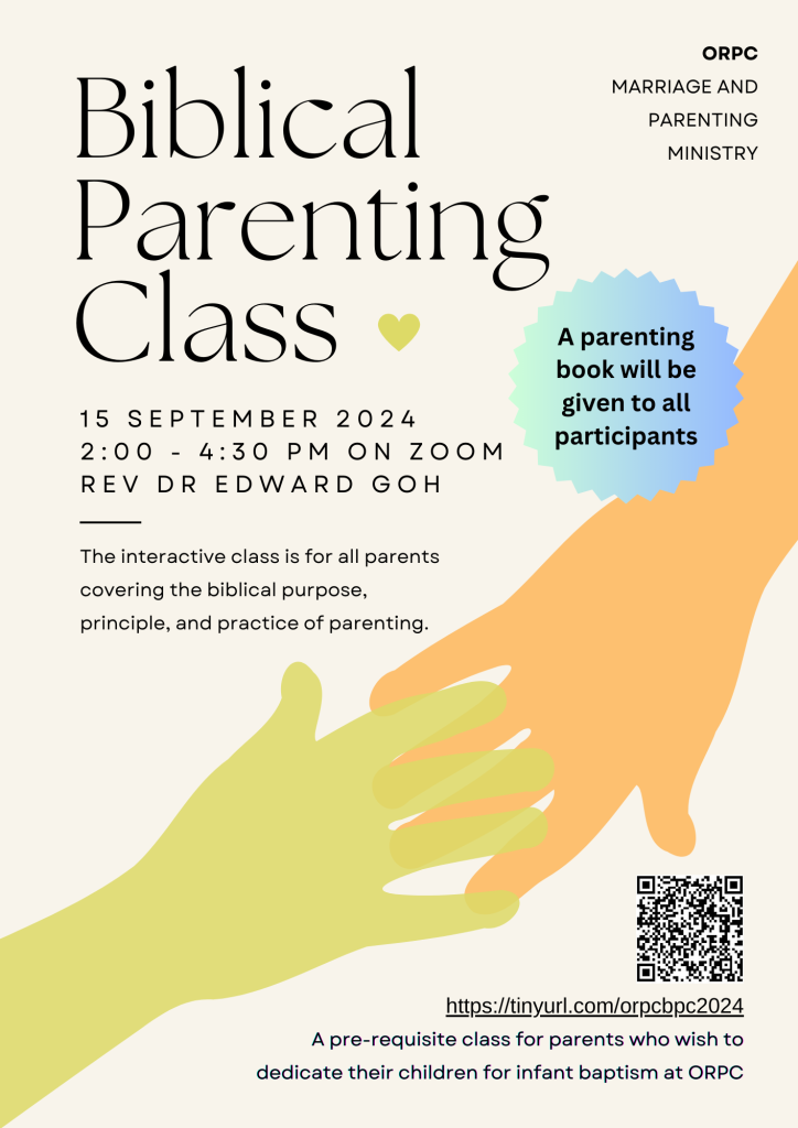 A prerequisite class for parents who wish to dedicate their children for infant baptism at ORPC. Register for the class by Sunday, 8 Sep 2024. Infant baptism will be on Sunday, 3 Nov 2024.