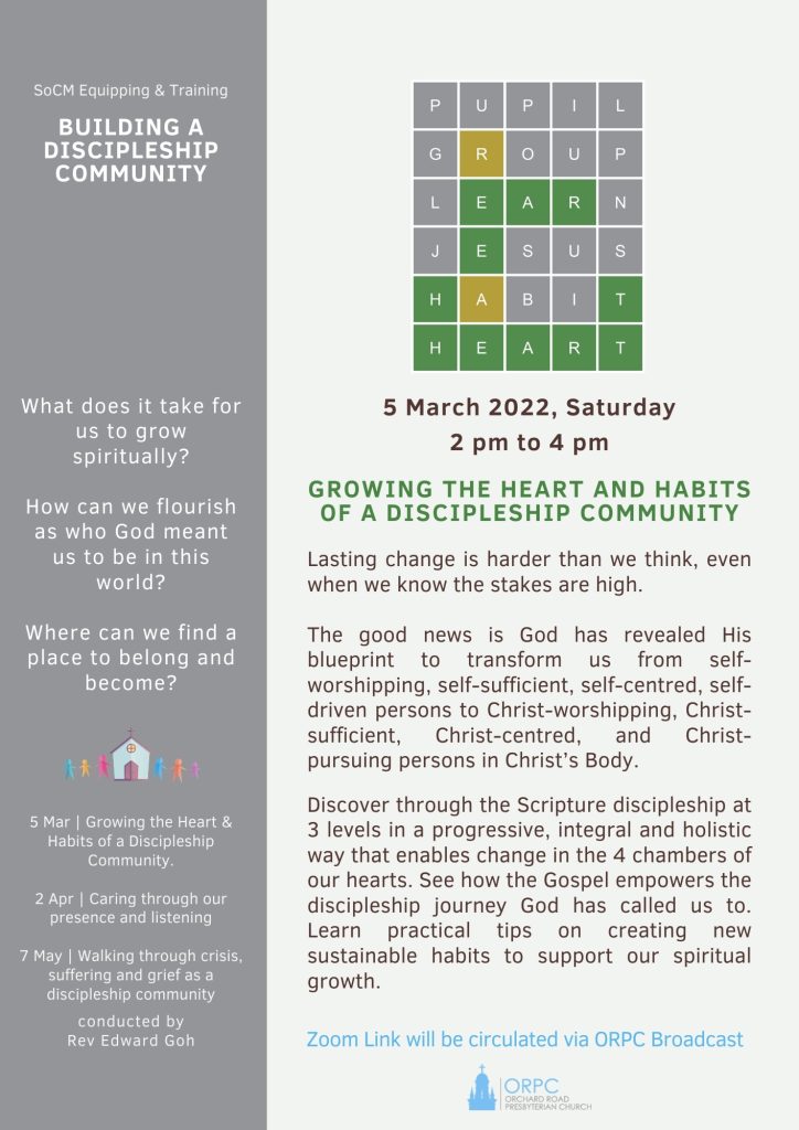 Growing the Heart and Habits of A Discipleship Community Date 5 Mar 2022 Time 2:00 PM – 4:00 PM Venue Zoom