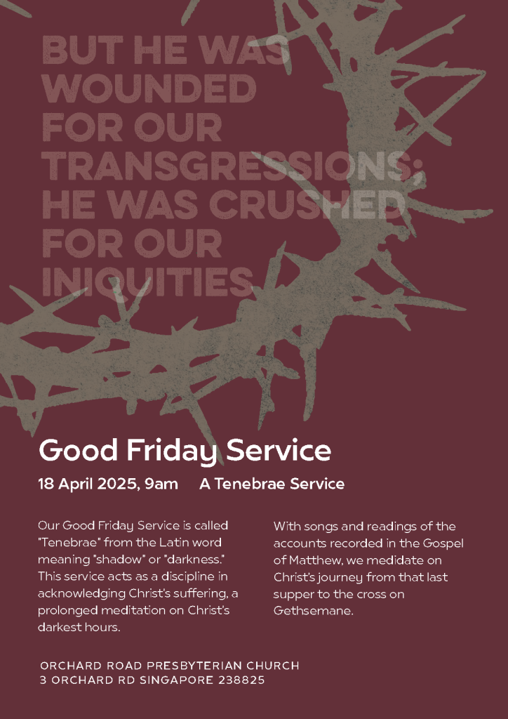 Good Friday Service Date 18 Apr 2025 Time 9:00 AM Address 3 Orchard Road Singapore 238825 Directions Venue ORPC Sanctuary Category Special Services