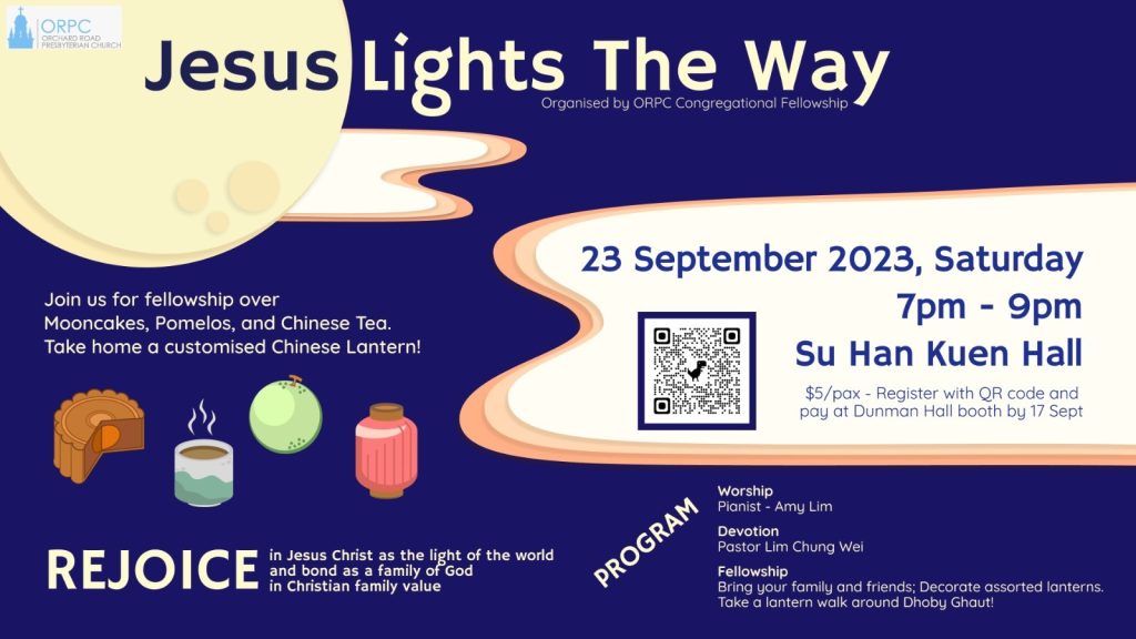 Join us for fellowship over mooncakes, pomelos and Chinese tea. Take home a customised Chinese lantern!