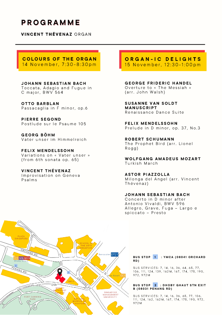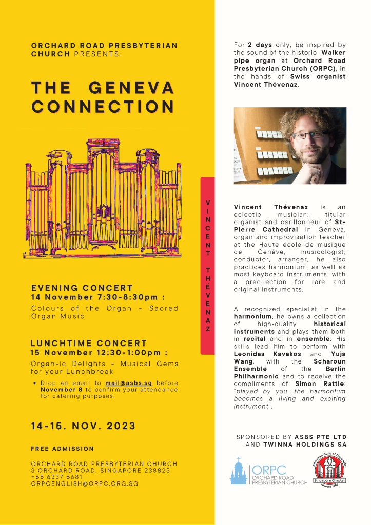 Organ Concert by Vincent Thévenaz (Evening Concert) Date 14 Nov 2023 Time 7:30 PM – 8:30 PM Venue ORPC Sanctuary