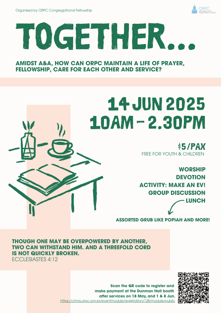 - Make payment at the Dunman Hall booth after services on 18 May or 1 & 8 June.